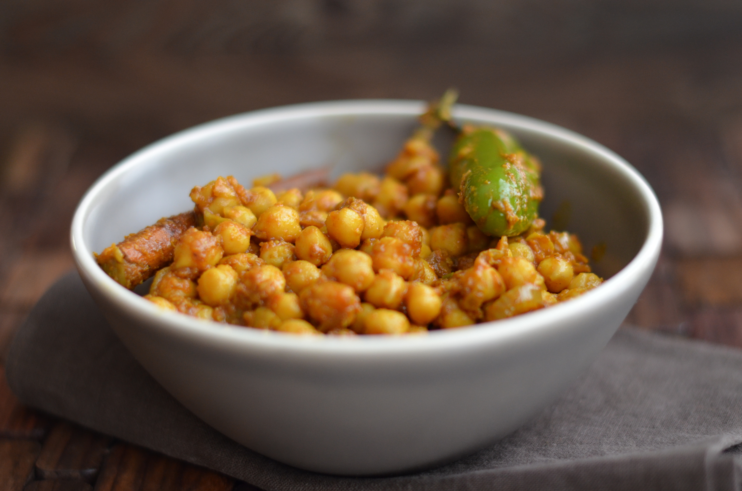 Na głębokiej patelni rozgrzewamy tłuszcz, dodajemy strączki kardamonu, cynamon i kmin rzymski. Smażymy na małym ogniu, aż przyprawy zaczną wydzielać aromat. Dodajemy papryczki oraz cebulę i smażymy tak długo, aż cebula zacznie lekko brązowieć. Dodajemy czosnek, passatę pomidorową, imbir, kurkumę, kolendrę i ostrą paprykę (opcjonalnie). Solimy i gotujemy około 10 minut, często mieszając. Dodajemy odcedzoną z zalewy ciecierzycę i 500 ml wody, doprowadzamy do wrzenia i gotujemy na małym ogniu przez około 8 minut. Dodajemy garam masalę, dokładnie mieszamy i jeszcze raz doprawiamy solą.