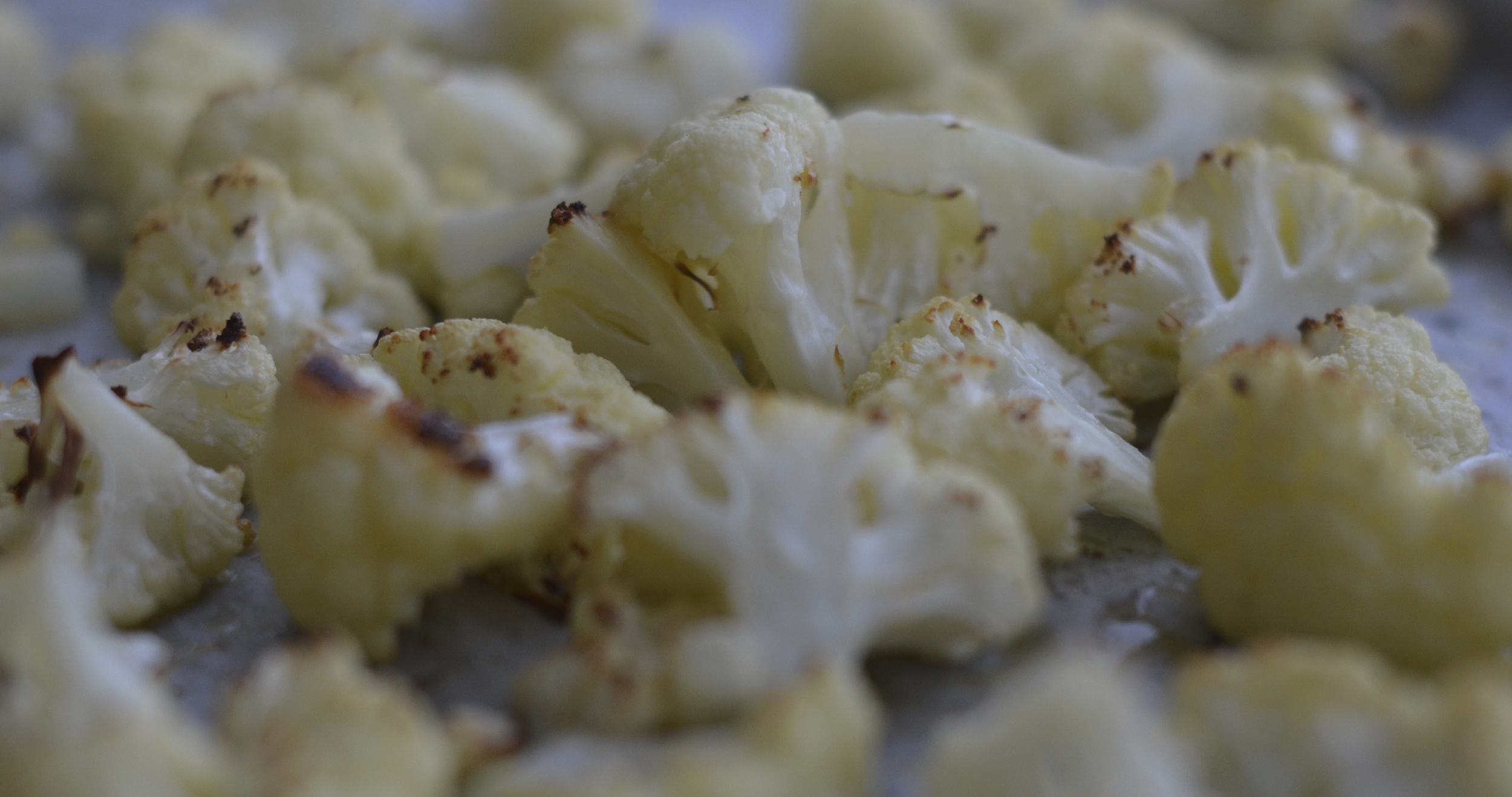 Piekarnik rozgrzewamy do temperatury 200 °C. Na dużej blaszce, wyłożonej papierem do pieczenia, rozkładamy cząstki kalafiora, skrapiamy je oliwą i solimy. Pieczemy przez 15 minut, a następnie włączamy termoobieg i dopiekamy jeszcze 5 minut. W tym czasie kalafior powinien się trochę przyrumienić, ale nie rozgotować.