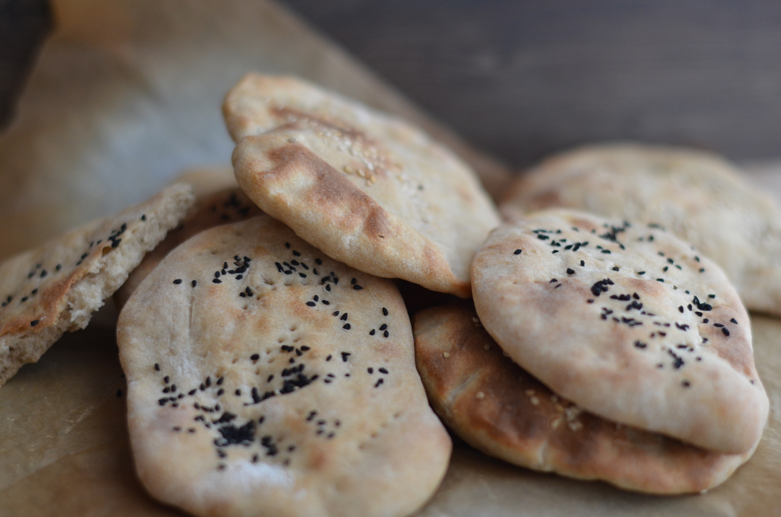 Po wyrośnięciu ciasto jeszcze raz wyrabiamy, formujemy wałek, który dzielimy na 8 równych części. Każdą część rozwałkowujemy na cienki placek, który możemy posypać ziarnami czarnuszki lub sezamu. Układamy placki na papierze do pieczenia (rozmiar papieru powinien pasować do blachy na której będą sie piekły chlebki). Z tej porcji wyjdą dwie blachy (2 x po 4 placki). Przykrywamy placki bawełnianą ściereczką i odstawiamy na 15 minut.