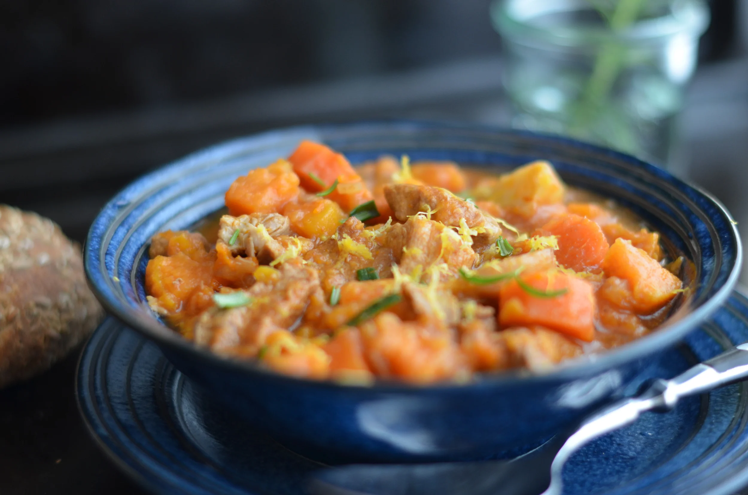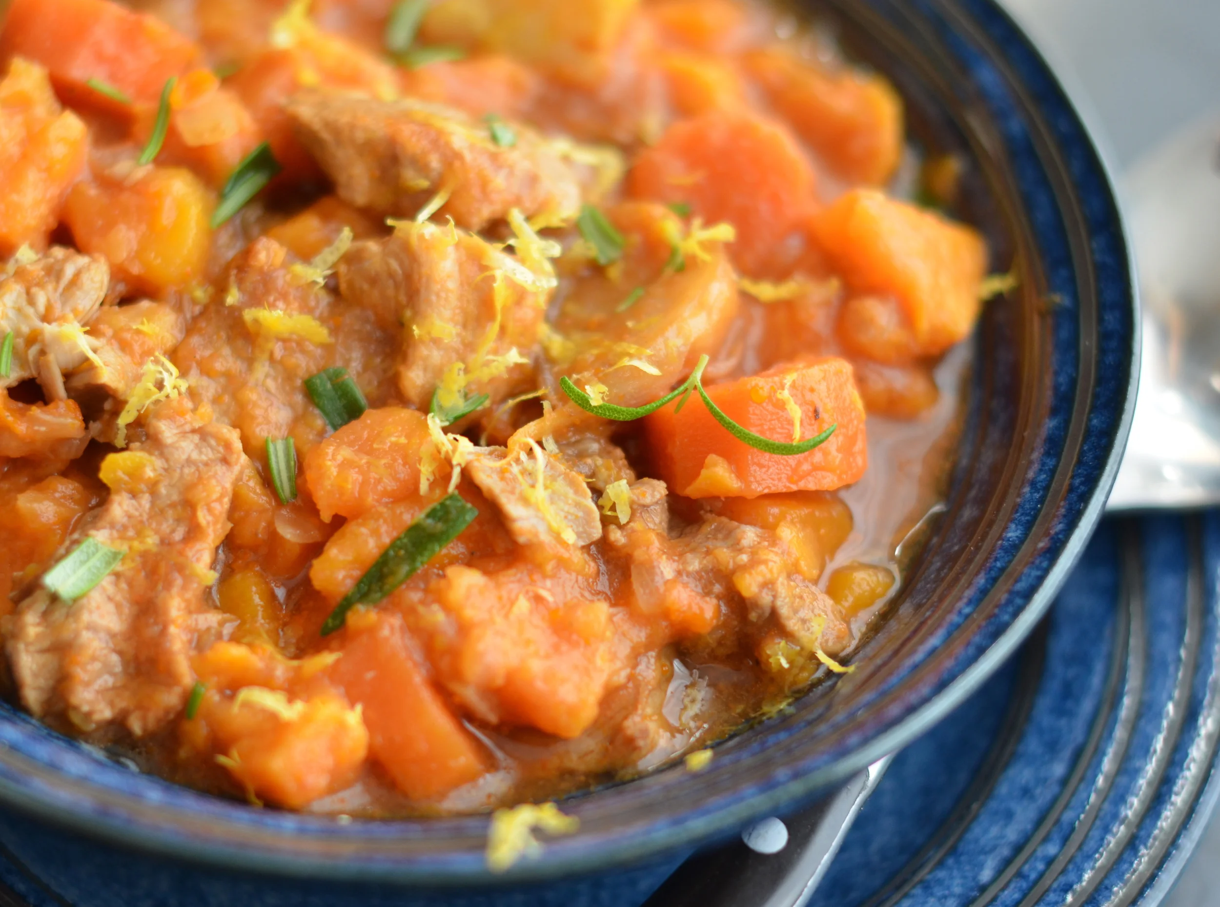 Przepis pochodzi z książki Jamiego Olivera “Jamie’s dinners”. W oryginale autor użył mięsa wołowego i dyni (butternut squash). Ja użyłam cielęciny i batatów.