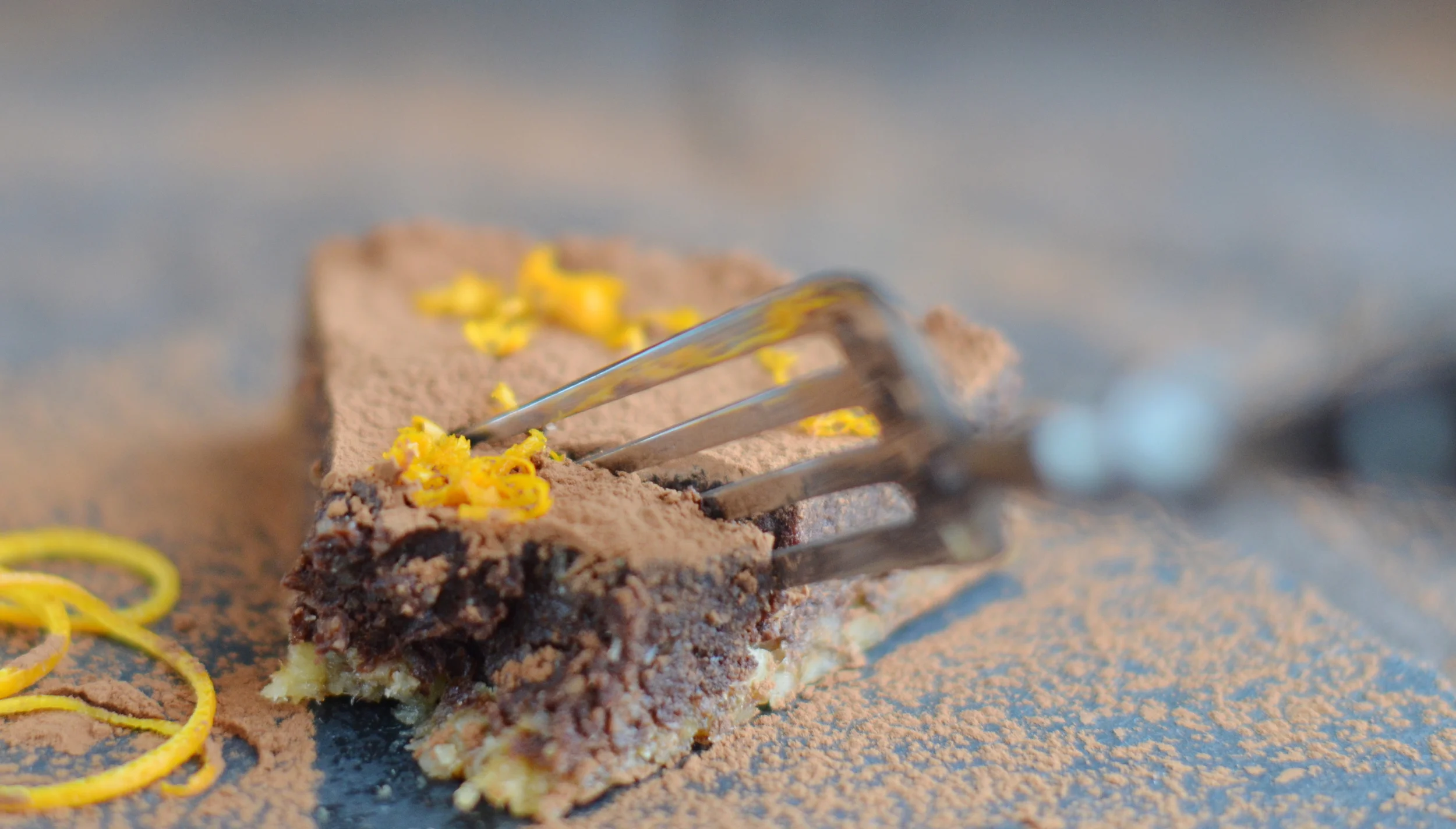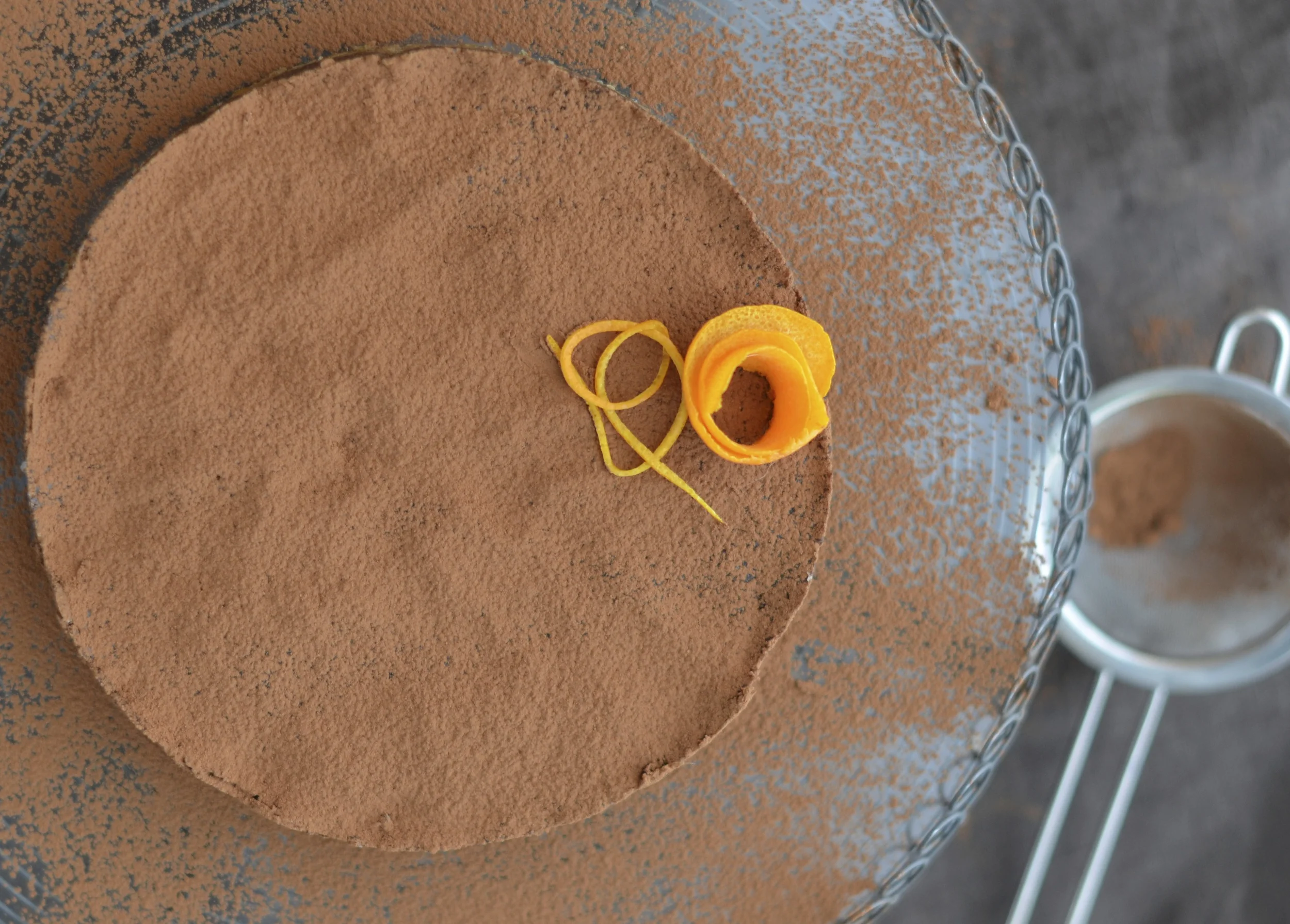 Przed podaniem ciasto posypujemy ciemnym kakao i skórką otartą z pomarańczy.​