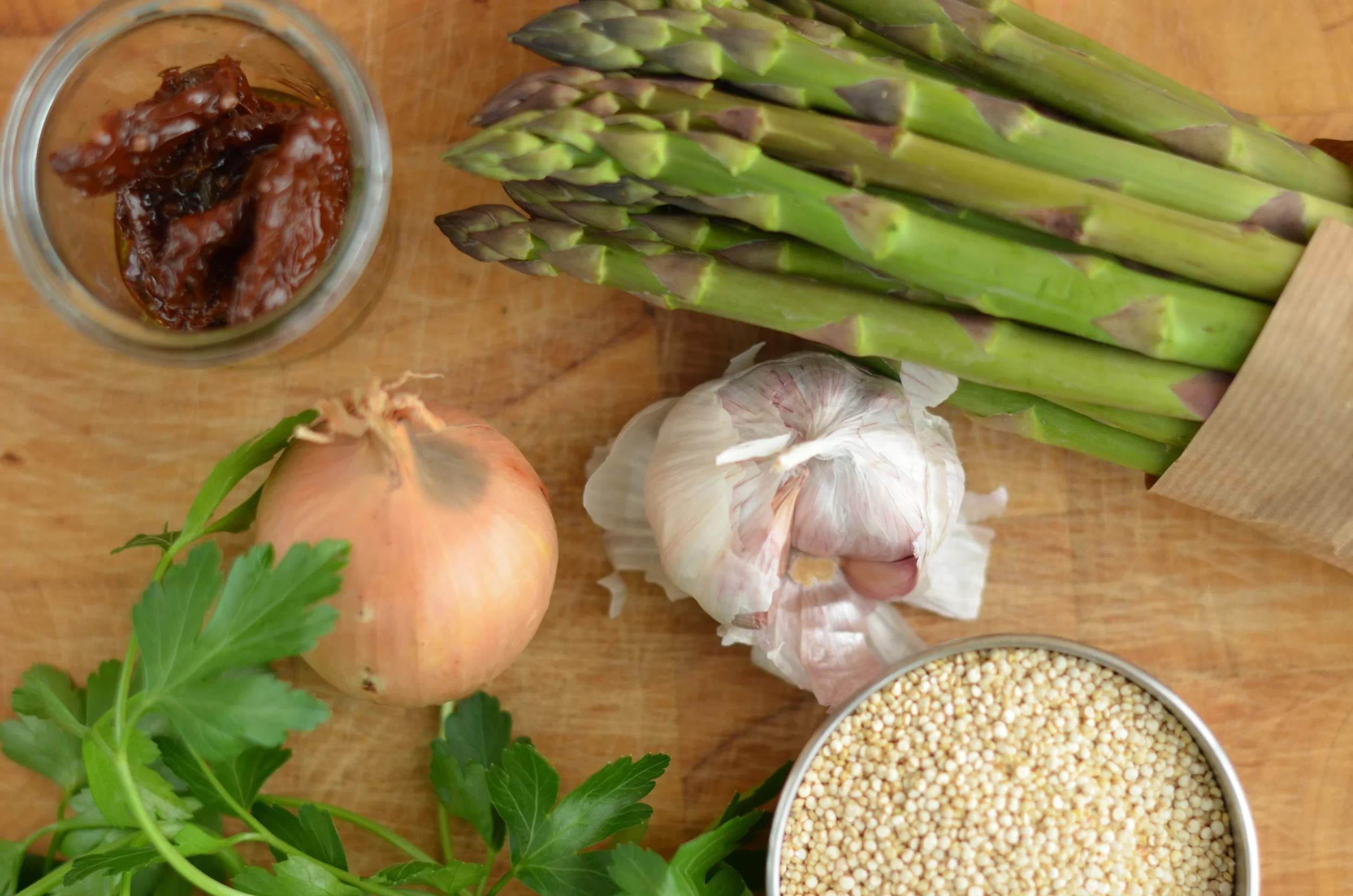 Uwielbiam połączenie zielonych szparagów z suszonymi pomidorami, tym razem w towarzystwie komosy ryżowej (quinoi).