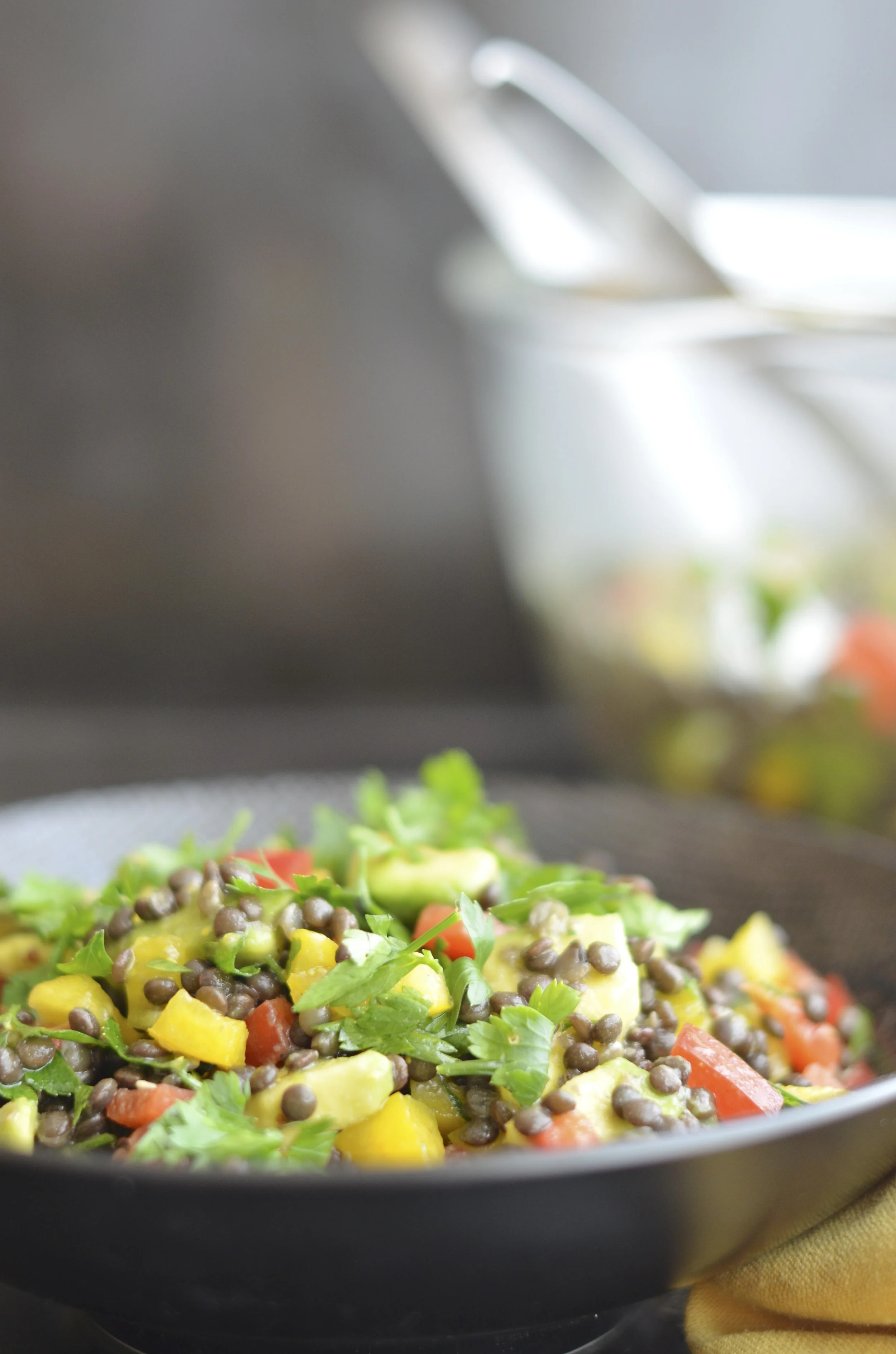 Robiąc porządki w kuchennych szafkach znalazłam resztki czarnej soczewicy (beluga lentils), z której najczęściej robię farsz do pierogów. Na lepienie pierogów nie miałam czasu, a chciałam koniecznie wyczyścić kuchnię z “resztek”. Ugotowałam soczewicę, wykorzystałam warzywa, które akurat miałam w lodówce i wyszła całkiem niezła sałatka.