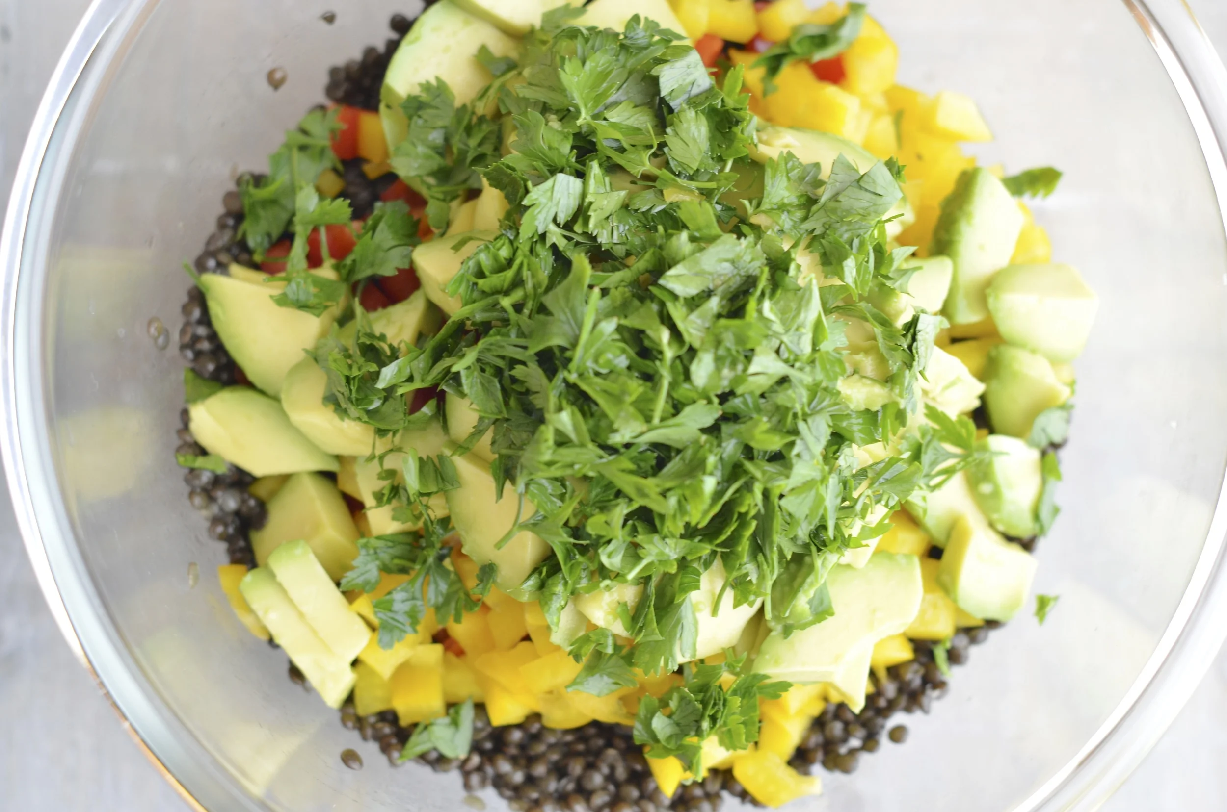 Robiąc porządki w kuchennych szafkach znalazłam resztki czarnej soczewicy (beluga lentils), z której najczęściej robię farsz do pierogów. Na lepienie pierogów nie miałam czasu, a chciałam koniecznie wyczyścić kuchnię z “resztek”. Ugotowałam soczewicę, wykorzystałam warzywa, które akurat miałam w lodówce i wyszła całkiem niezła sałatka.