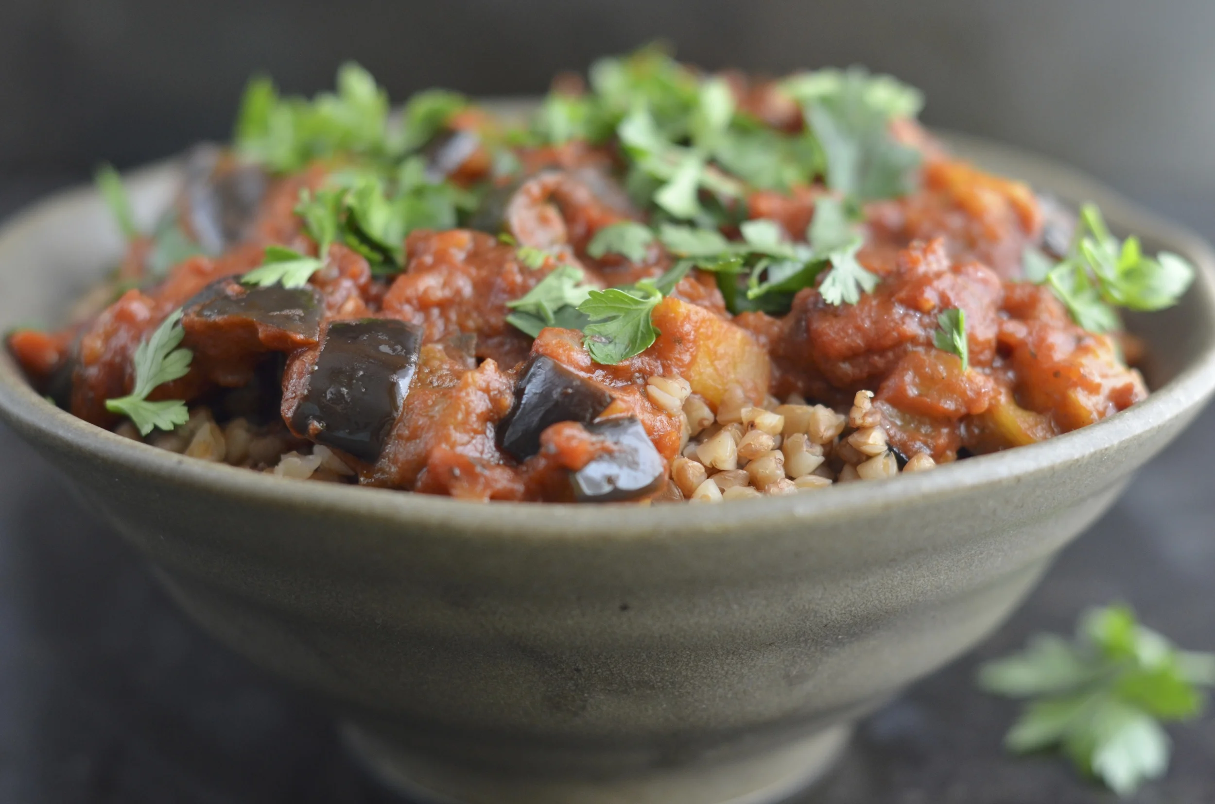 Pieczony bakłażan w sosie pomidorowym z kaszą gryczaną