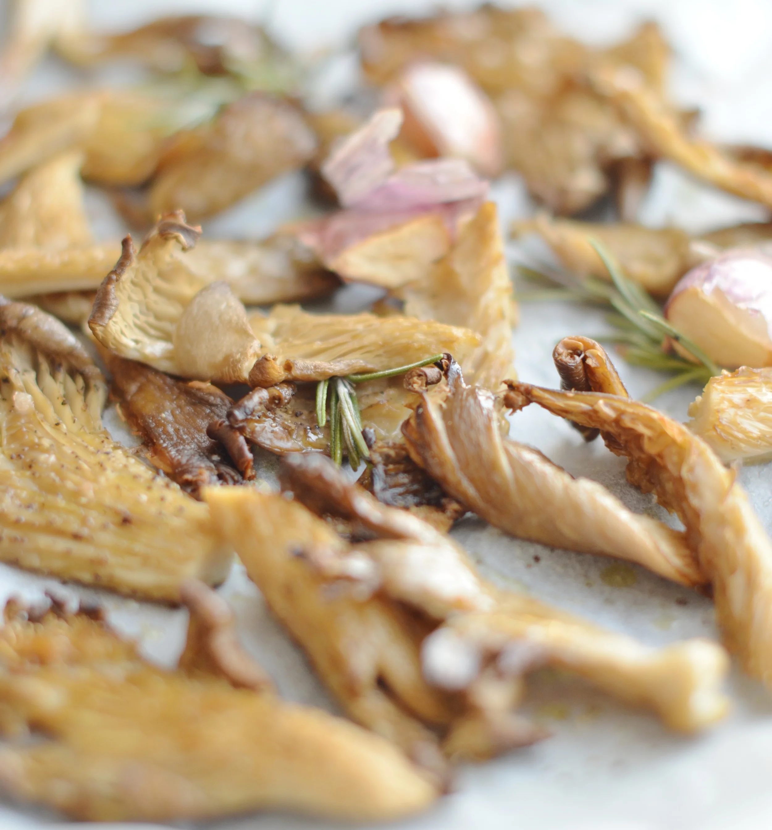 Odcinamy ogonki grzybów, duże kapelusze dzielimy na mniejsze części, a małe pozostawiamy w całości. Rozkładamy kapelusze na blaszce, obok kładziemy ząbki czosnku, całość skrapiamy oliwą, posypujemy porwanymi gałązkami rozmarynu, solą i pieprzem. Pieczemy około 15 minut (czas pieczenia zależy od sprawności piekarnika i wielkości grzybów). Grzyby w tym czasie powinny zmięknąć i lekko się zarumienić. Wyjmujemy grzyby, a czosnek może zostawić jeszcze na kilka minut w stygnącym piekarniku.