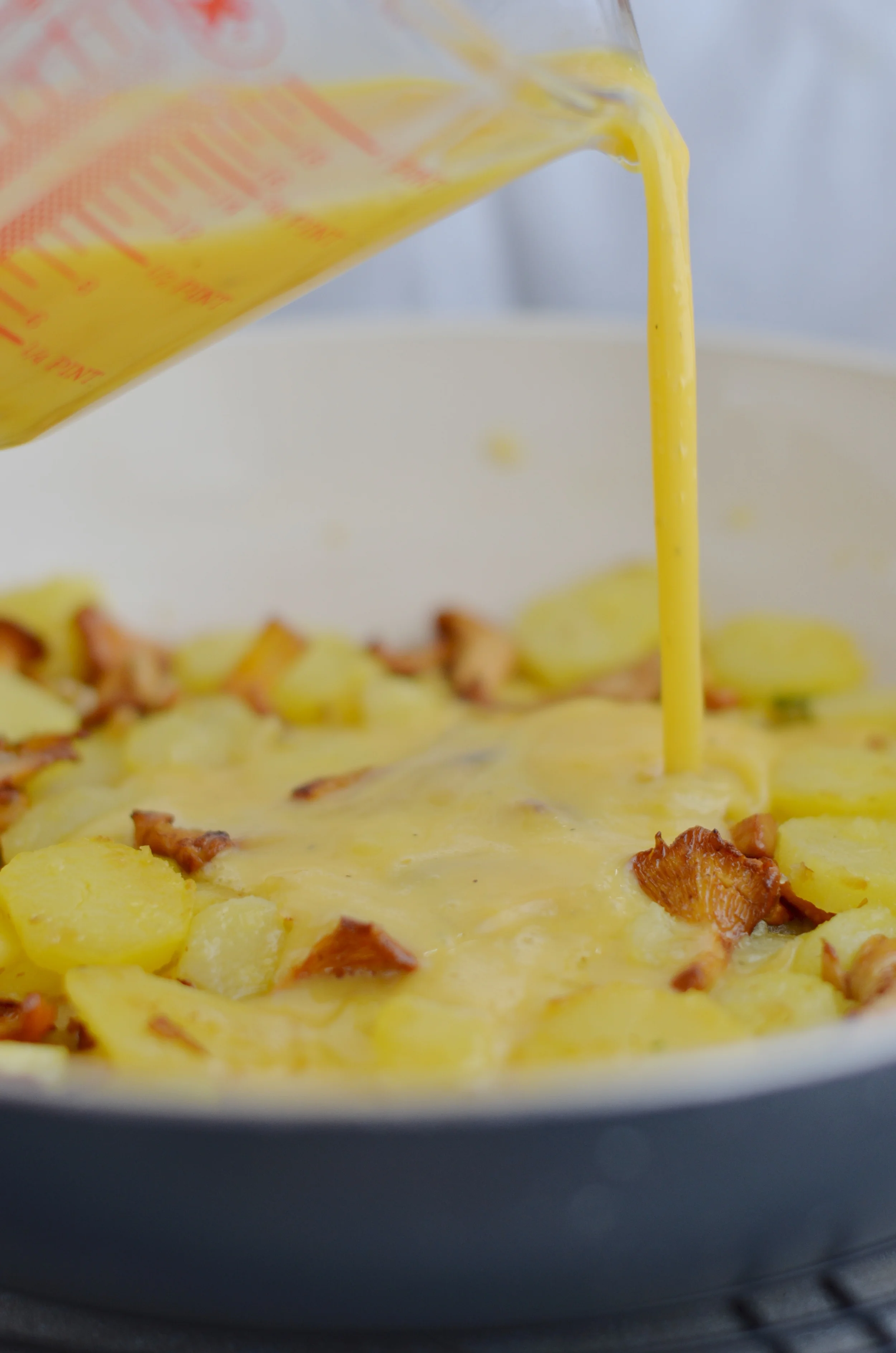 Do usmażonych ziemniaków dodajemy wcześniej przygotowane kurki, delikatnie mieszamy i jeśli trzeba dodajemy jeszcze łyżkę tłuszczu. Całość zalewamy jajkami. Masę jajeczną rozprowadzamy równomiernie po całej patelni przy pomocy drewnianej łyżki. Smażymy na małym ogniu potrząsając patelnią do czasu do czasu. Kiedy spód się zarumieni, a całość masy lekko zetnie, przykrywamy patelnię dużym, płaskim talerzem. Sprawnym ruchem przewracamy patelnię do góry dnem. W ten sposób tortilla znajdzie się na talerzu, upieczoną stroną do góry. Teraz delikatnie zsuwamy tortille na patelnię i podsmażamy drugą stronę, przez około 2 minuty. Jeśli chcemy sprawdzić stopień upieczenia spodu to delikatnie podnosimy brzegi tortilli przy pomocy drewnianej łopatki.