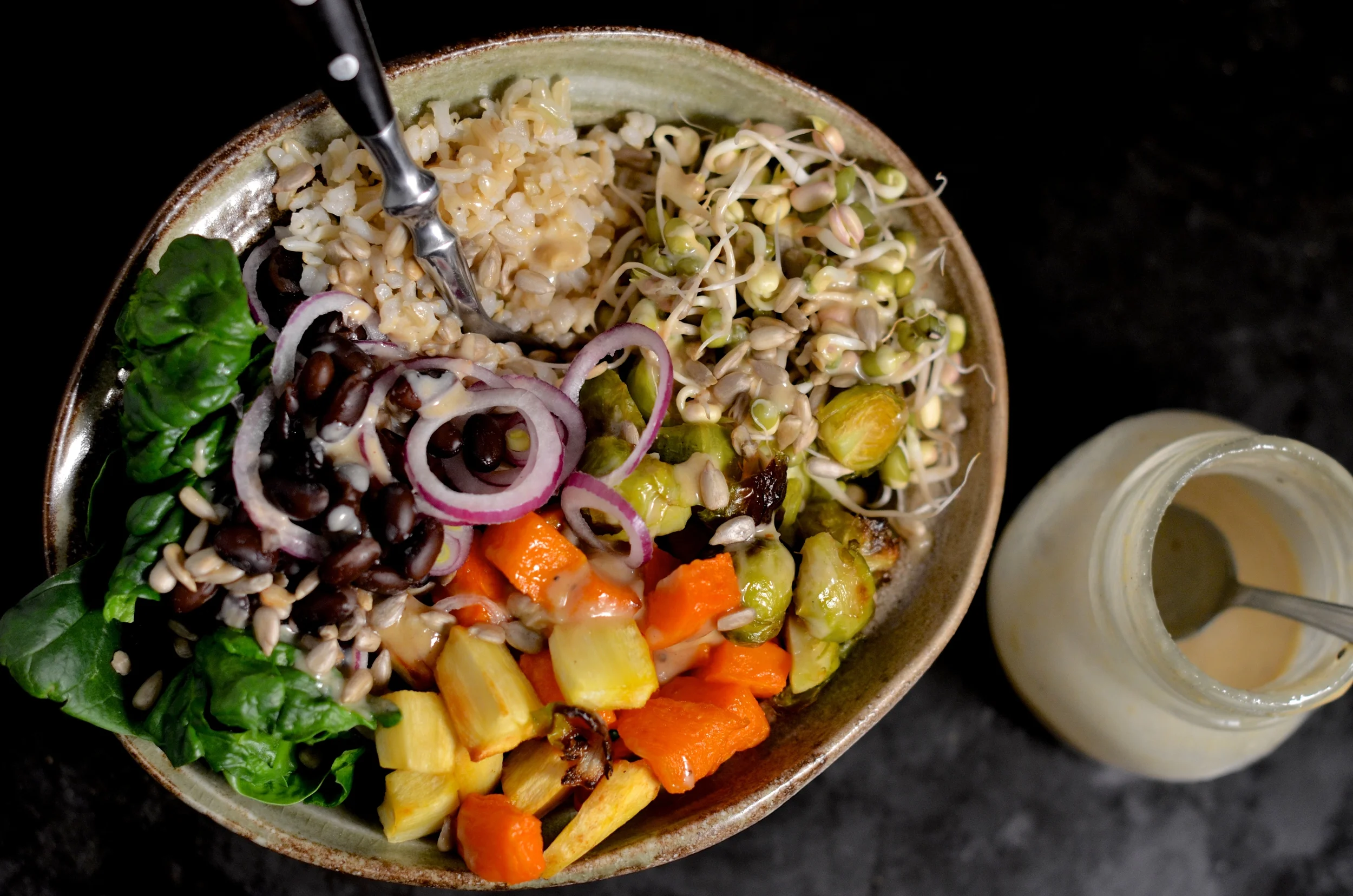 Jeśli skończyły Ci się pomysły na ciekawe, zimowe dania to zapraszam do skorzystania z mojej propozycji. Każdy może skomponować własną michę z ulubionych warzyw sezonowych i kasz. Ważne, żeby było smacznie, zdrowo i sezonowo. Sos tahini można zastąpić dowolnym, ulubionym sosem lub dobrej jakości oliwą. Taki zestaw możemy przygotować wieczorem i rano zabrać do pracy na drugie śniadanie lub lunch (radzę pominąć cebulę i czosnek).