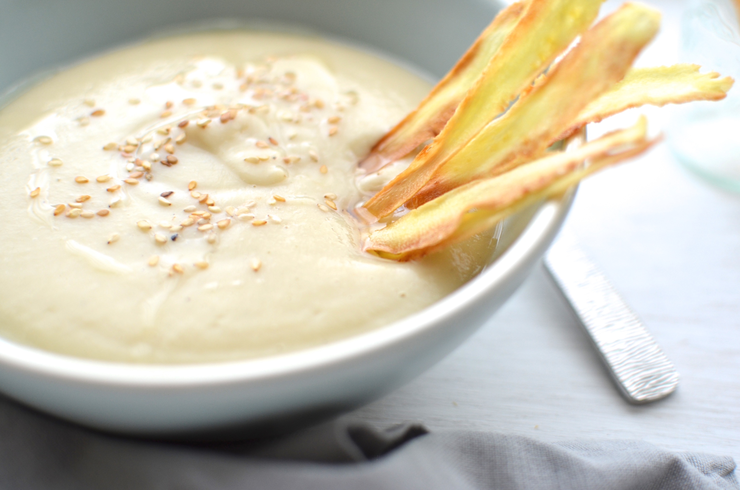 Gorącą zupę podajemy z chipsami z pasternaku, odrobiną oleju sezamowego i prażonym sezamem.
