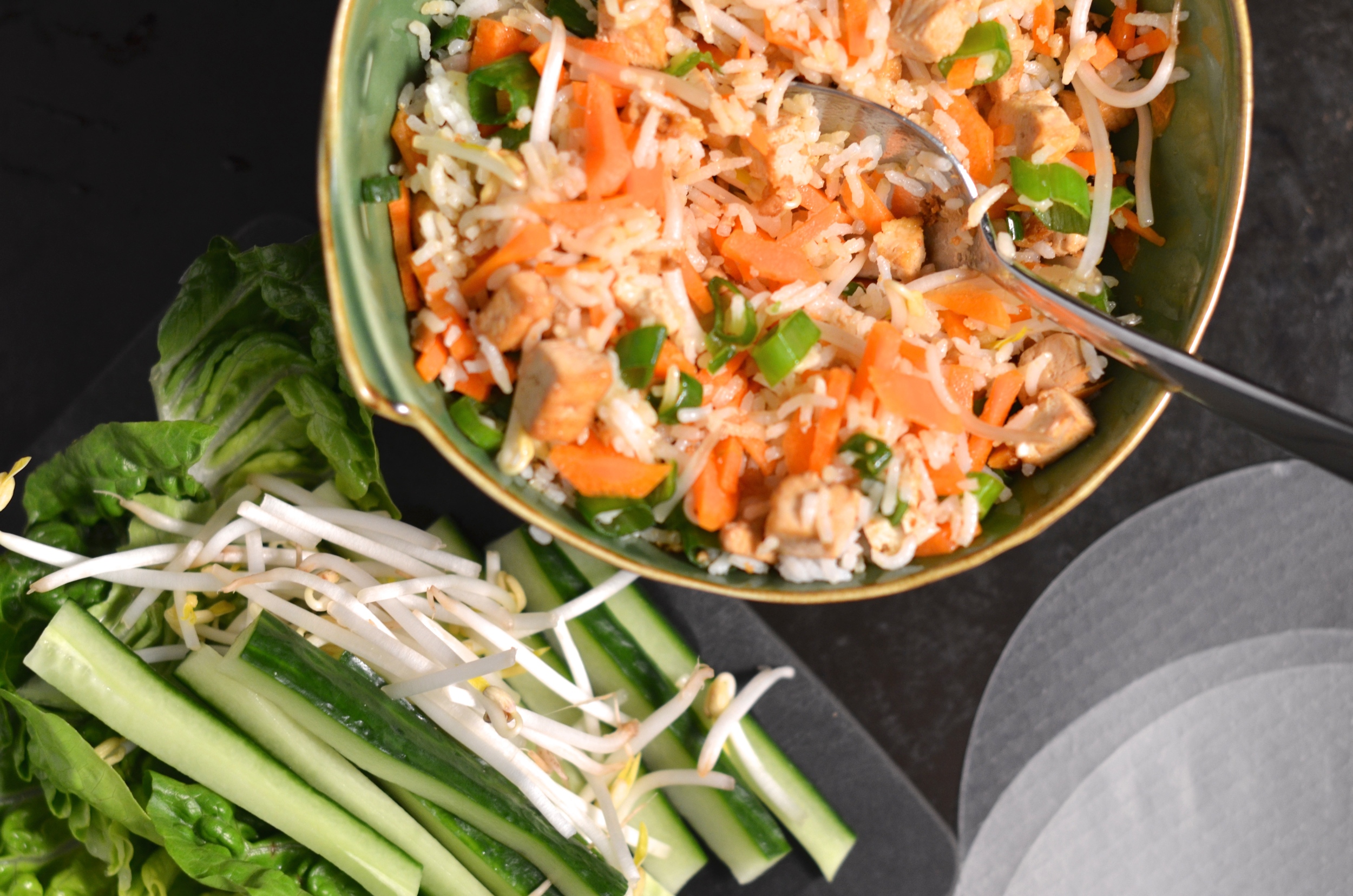 Na środku papieru układamy porcję ryżu, następnie kawałek sałaty lub listki szpinaku, kawałek ogórka i odrobinę kiełków. Zawijamy boki papieru ryżowego do środka, a następnie zwijamy rulonik. Przekładamy na talerz i przykrywamy czystą, wilgotną ściereczką. To samo robimy z pozostałymi kawałkami papieru ryżowego.