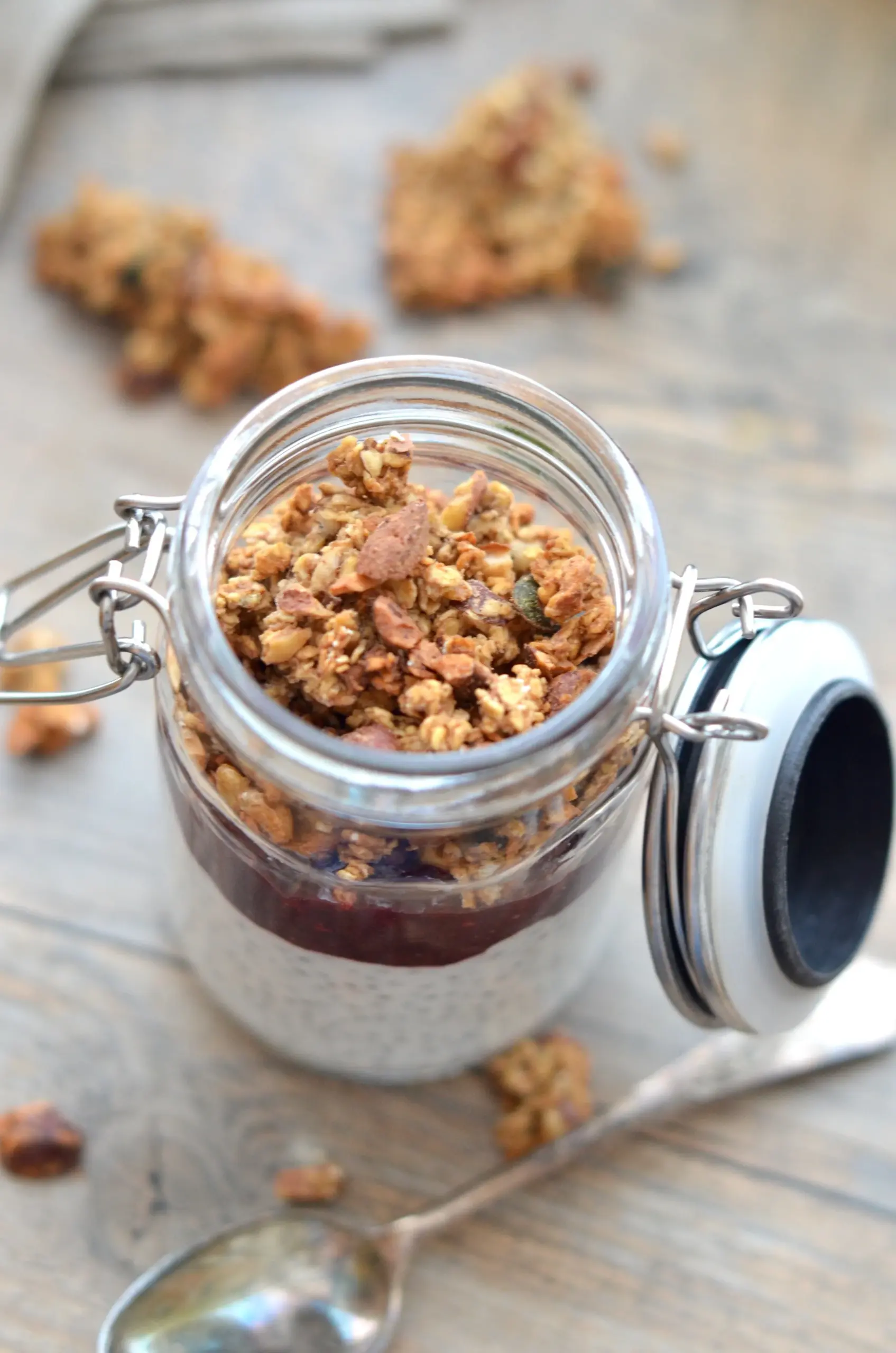 Polecam dodanie granoli do puddingu kokosowego z nasionami chia (szałwia hiszpańska) z tego przepisu. W zimie używam mrożonych mieszanek owocowych zamiast truskawek.