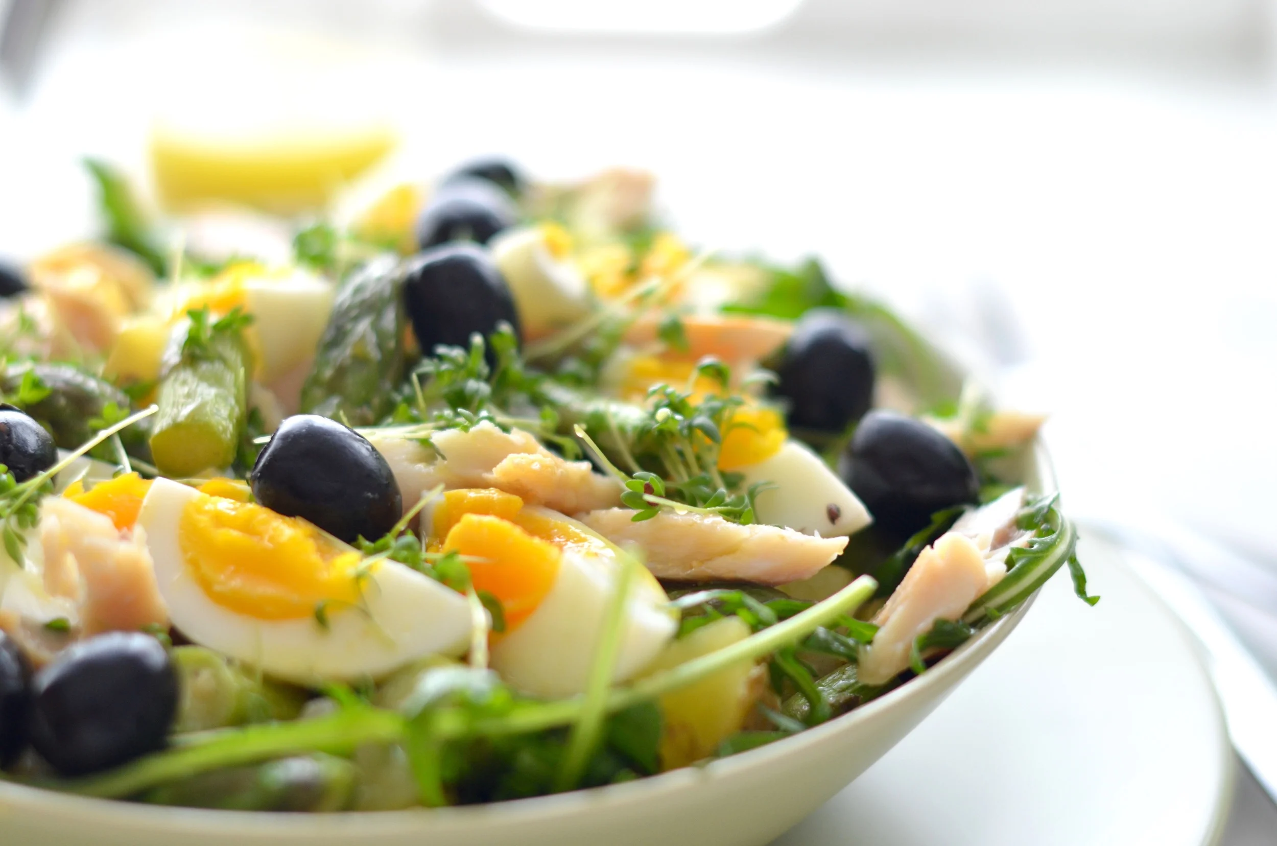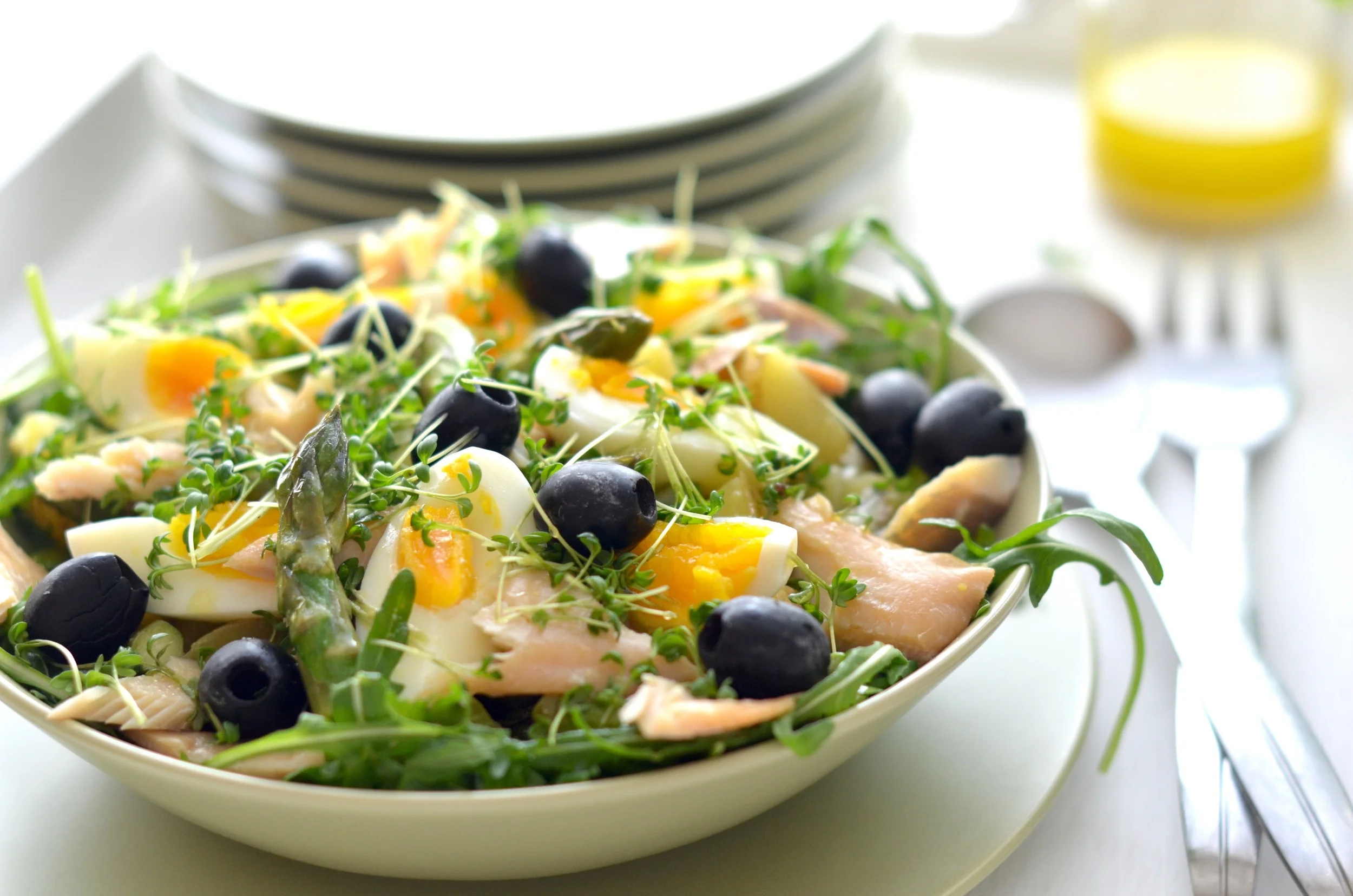 W dużej misce lub na talerzu rozkładamy rukolę. Na wierzchu układamy ziemniaki, szparagi, jajka i podzielonego na cząstki pstrąga lub łososia. Dodajemy oliwki i kiełki. Całość polewamy sosem (połową tego co zostało), przyprawiamy solą i pieprzem.