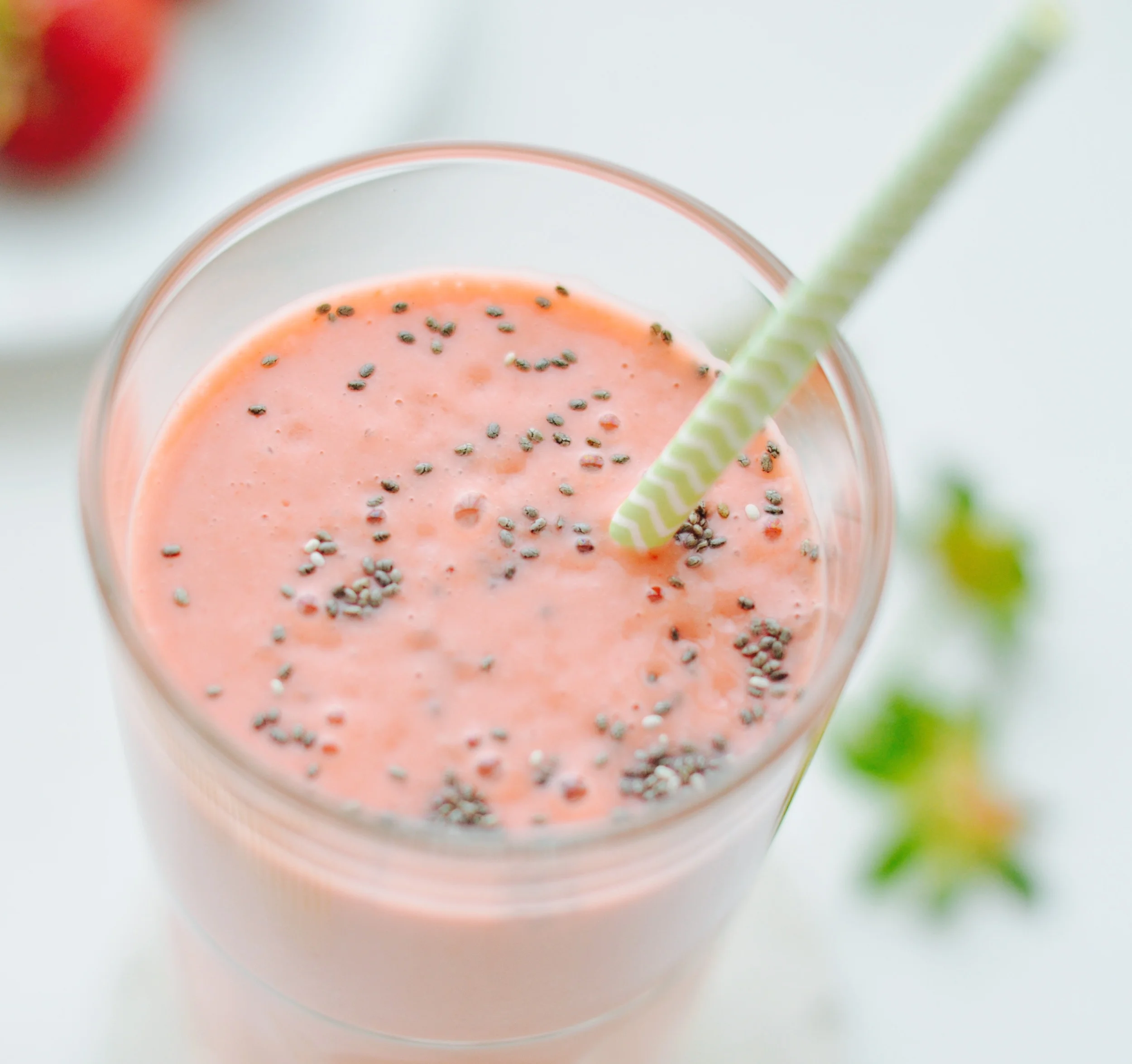 Rozlewamy koktajl do szklanek i posypujemy ziarenkami chia lub zmielonym siemieniem lnianym.