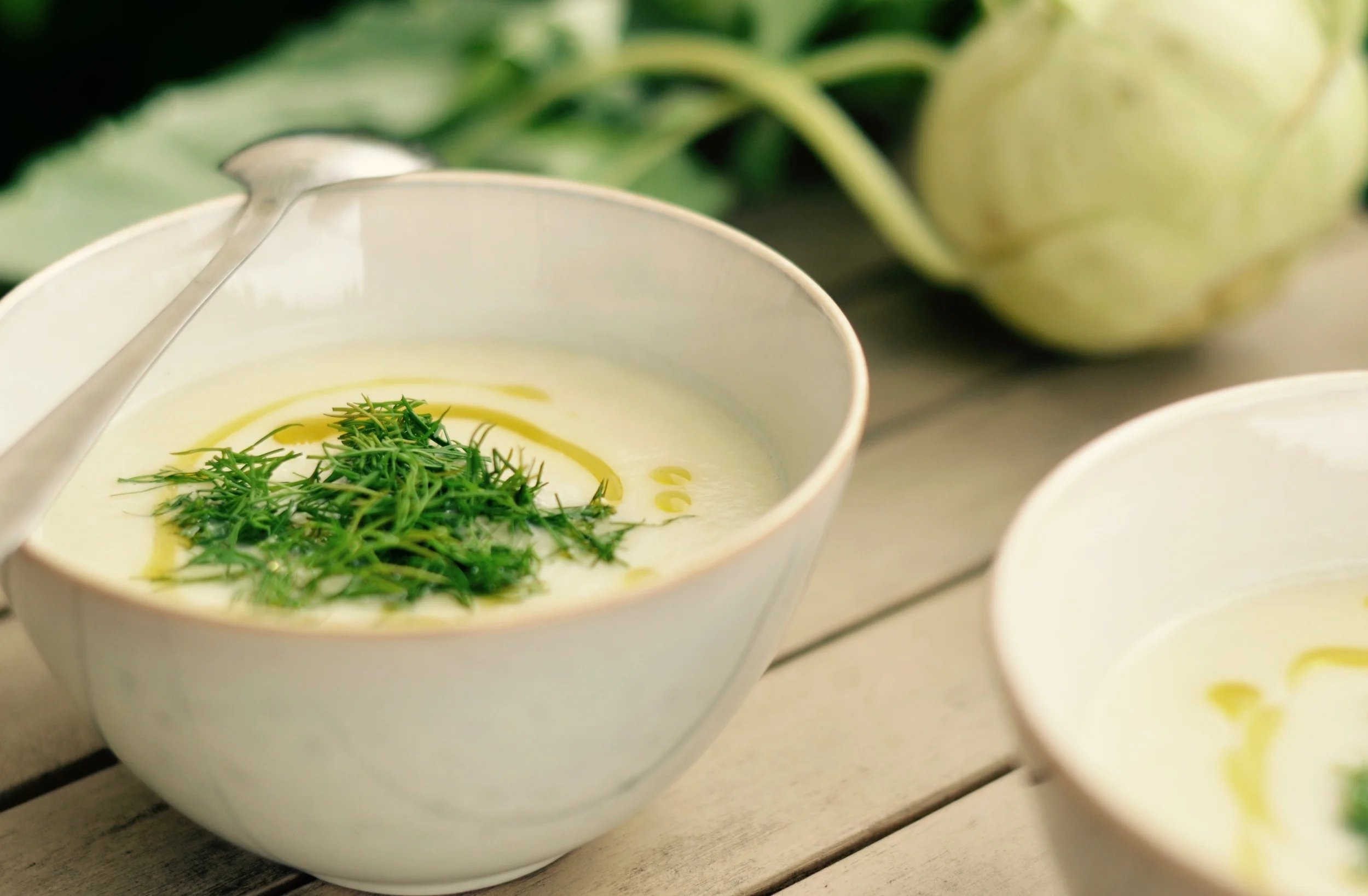 Gorącą zupę podajemy ze świeżym koperkiem i odrobiną oliwy.
