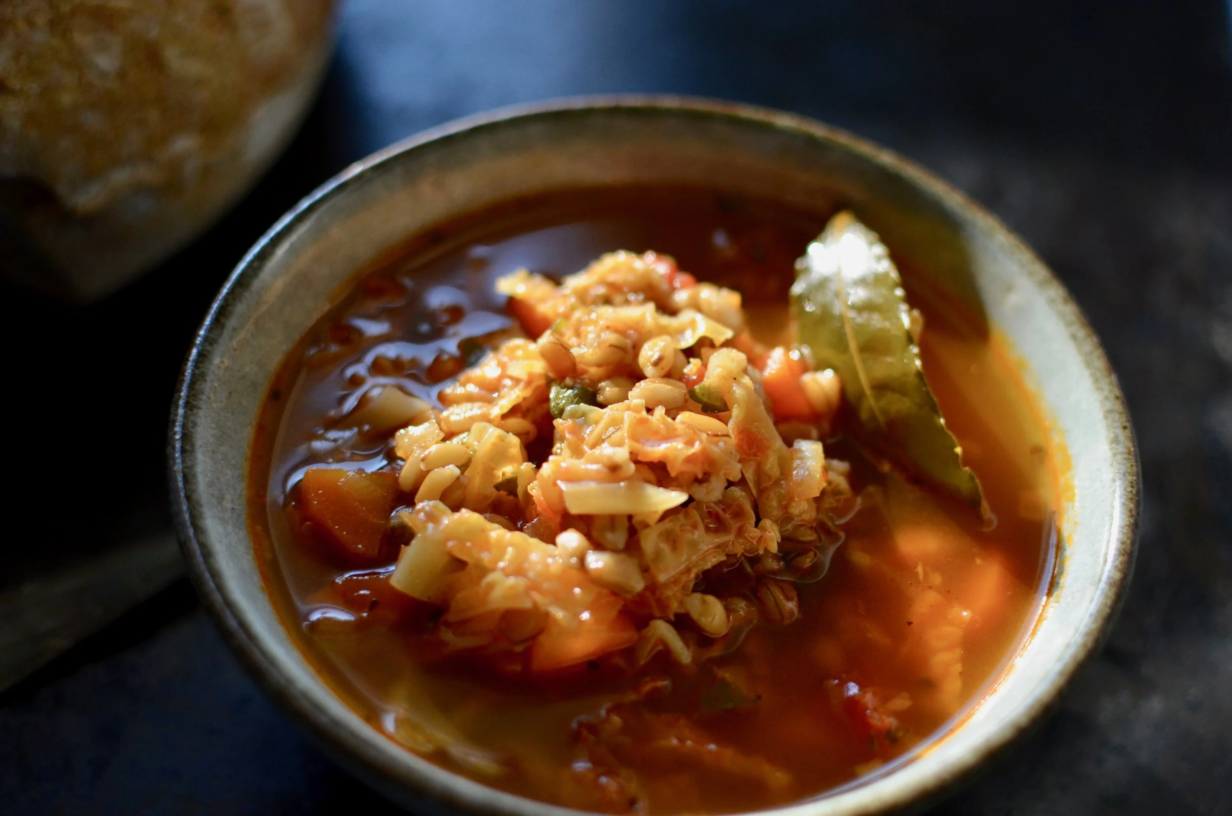 Skorzystałam z przepisu na zupę orkiszową z książki „Zupy” Annie Bell. Ugotowałam wersję wegetariańską z dodatkiem wędzonej papryki. Nie jest to zupa dla amatorów delikatnych bulionów lub kremów. To raczej konkretna, gęsta i bardzo sycąca zupa, idealna na zimowe dni. Zdecydowanie lepsza na drugi dzień, po tym jak się przegryzie.