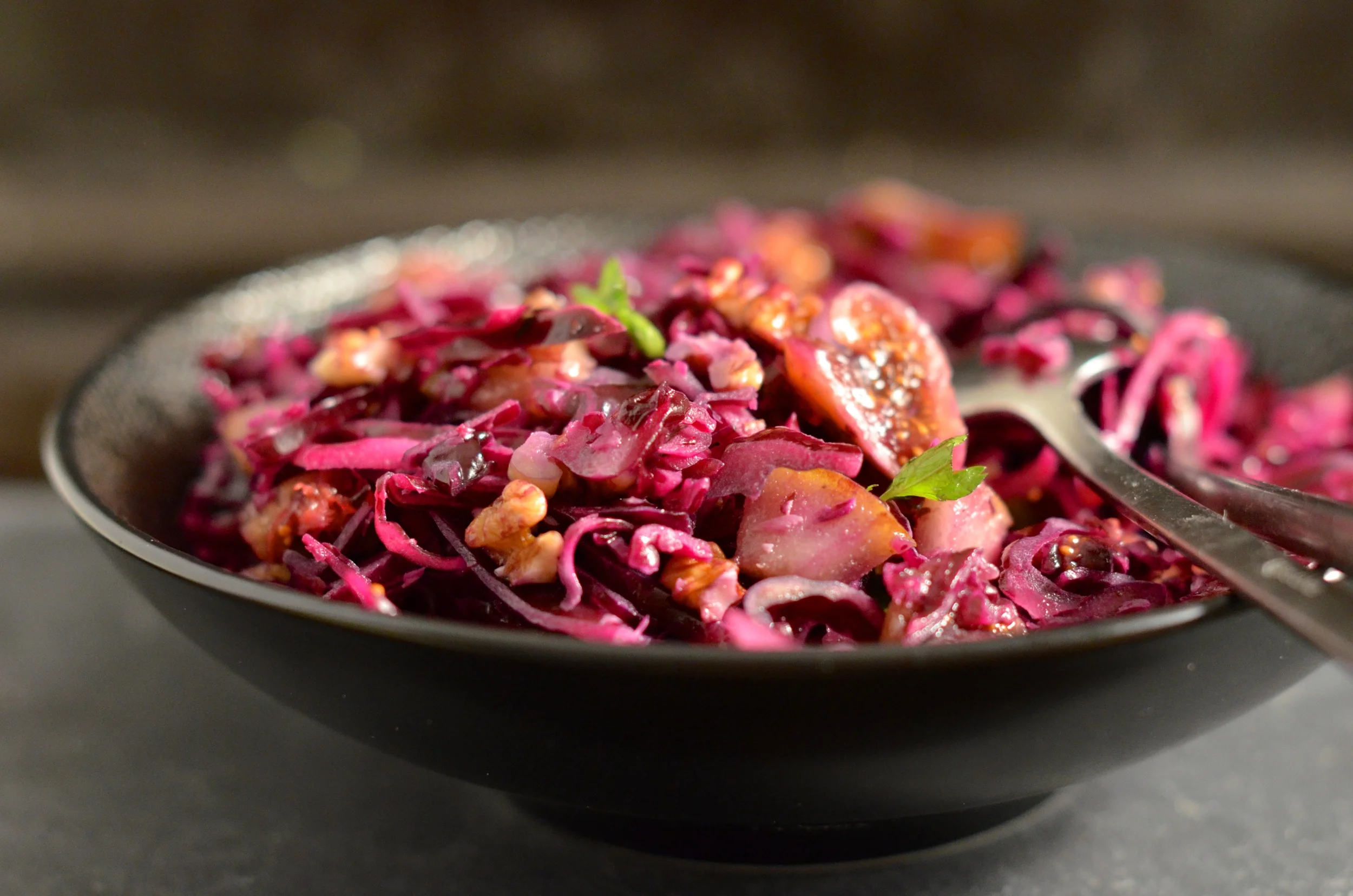 Zimowa surówka z czerwonej kapusty, gruszek i suszonych fig