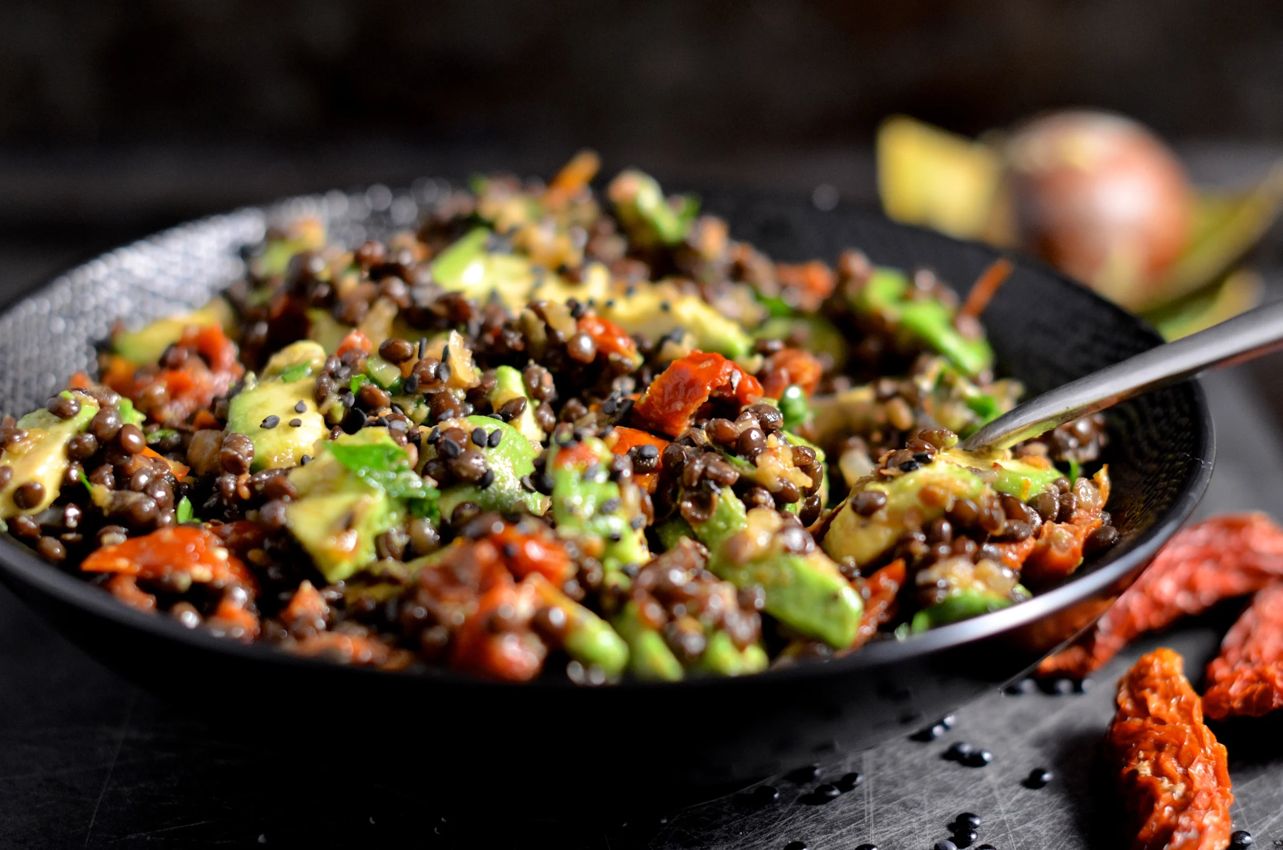 Sałatka z czarnej soczewicy, suszonych pomidorów i awokado