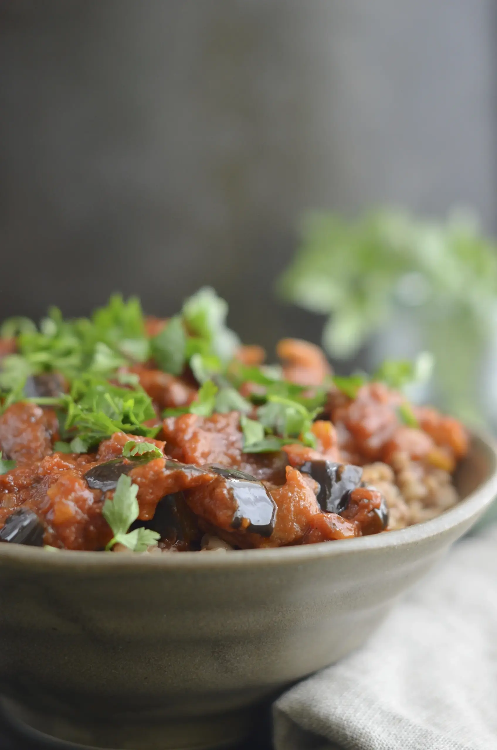 Pieczony bakłażan w pomidorach z kaszą gryczaną